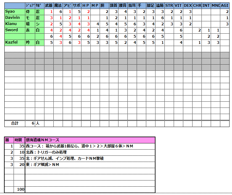 | 名前 | ジョブ | 頭 | 胴 | 手 | 脚 | 足 | ||||||||||